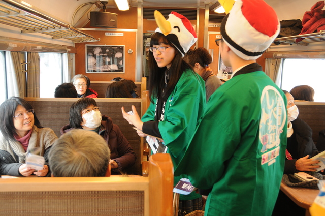 生徒はお揃いのはっぴとタンチョウ型の帽子をまとい、乗客に標茶町のパンフレットと地元スイーツを手渡しながら、地名の意味や由来、野生動物の紹介などをしました。