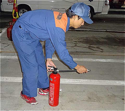 | ●天ぷら油の炎は消火器で上からかけてしまうと油が 飛び散り他のものへ火が移ってしまいます。 2~3メートル離れた位置から鍋と水平になるように 消火します。 |