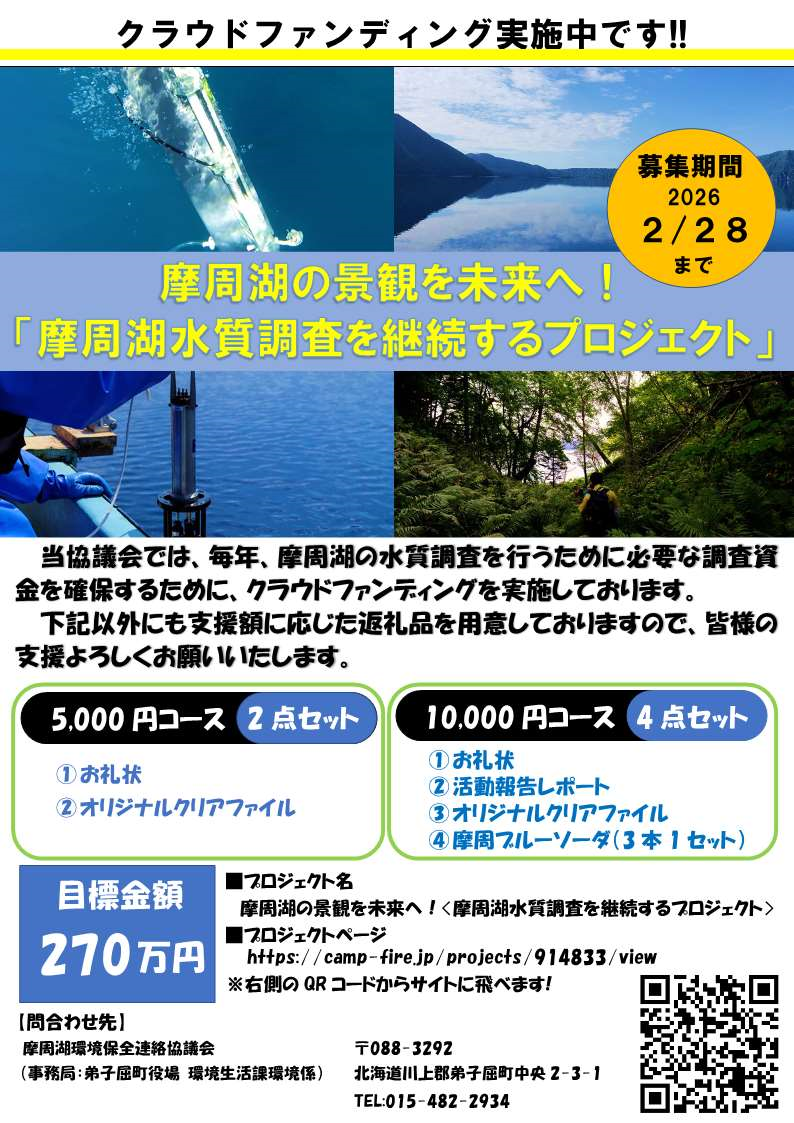 トップ > 各課の仕事 > 企画財政課 > お知らせ > 摩周湖水質調査継続事業のクラウドファンディングを実施しています!